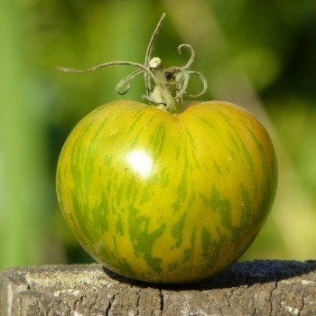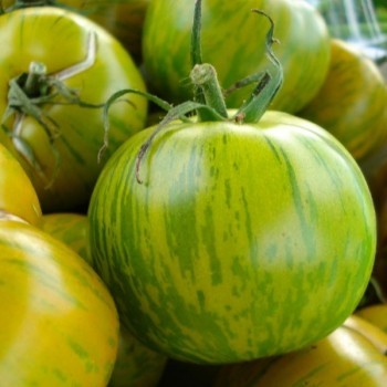Très productive, cette variété mi-précoce (75 à 85 jours) à croissance indéterminée produit des fruits ronds à côtelés de 80 à 120 g à chair verte, juteuse et légèrement acidulée. La peau vert jaune est striée de vert sombre puis jaune panaché de zébrures vertes à maturité.